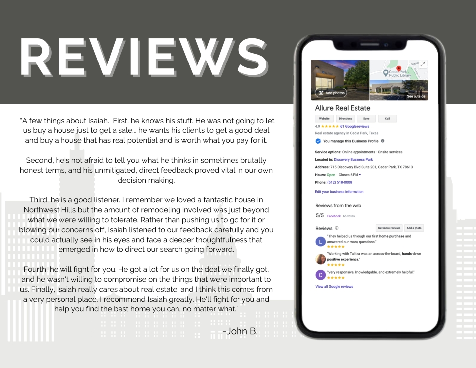 "Isaiah is the most creative and detail-oriented real estate experience my family has ever known. We were able to partner with him to create a vision of where we wanted to live in Austin, create a workable budget, then create the intention to find the best home for us using all the real estate tools he knows so well."